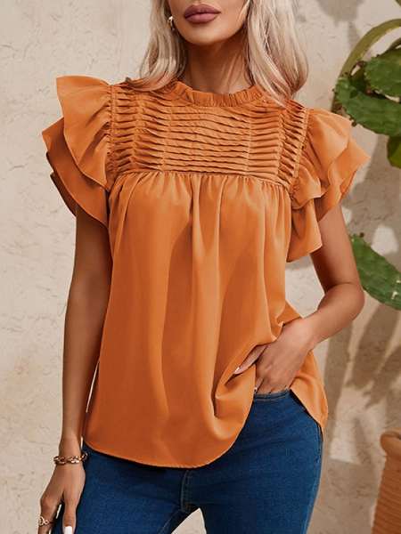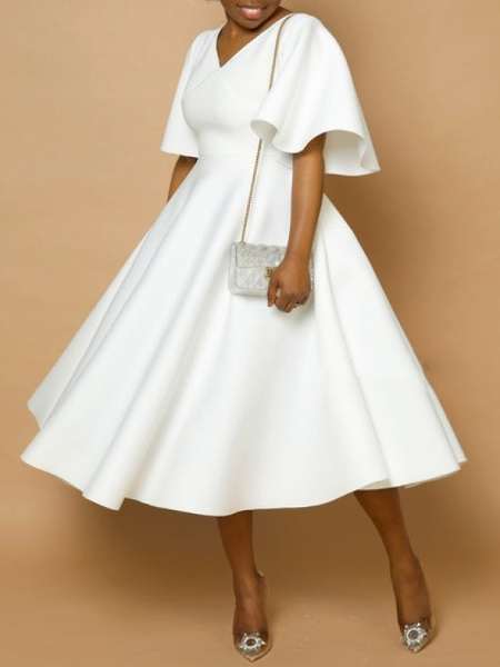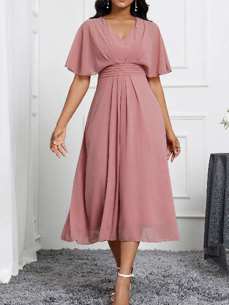 Women's Plain V-Neck Butterfly Sleeve Pleat Dress