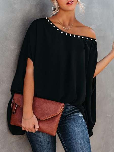 Fashionable Off-shoulder Beaded Loose T-Shirt